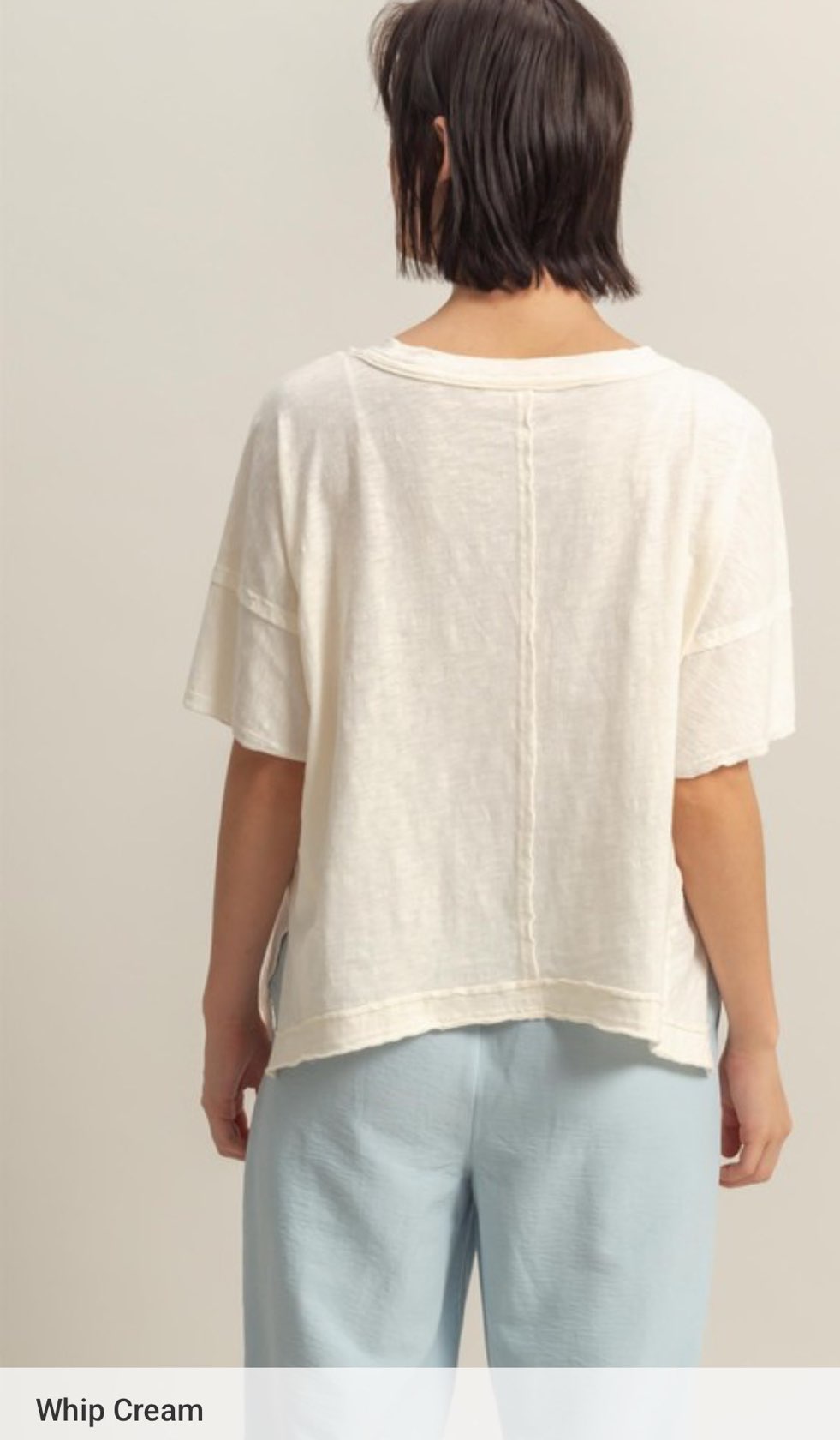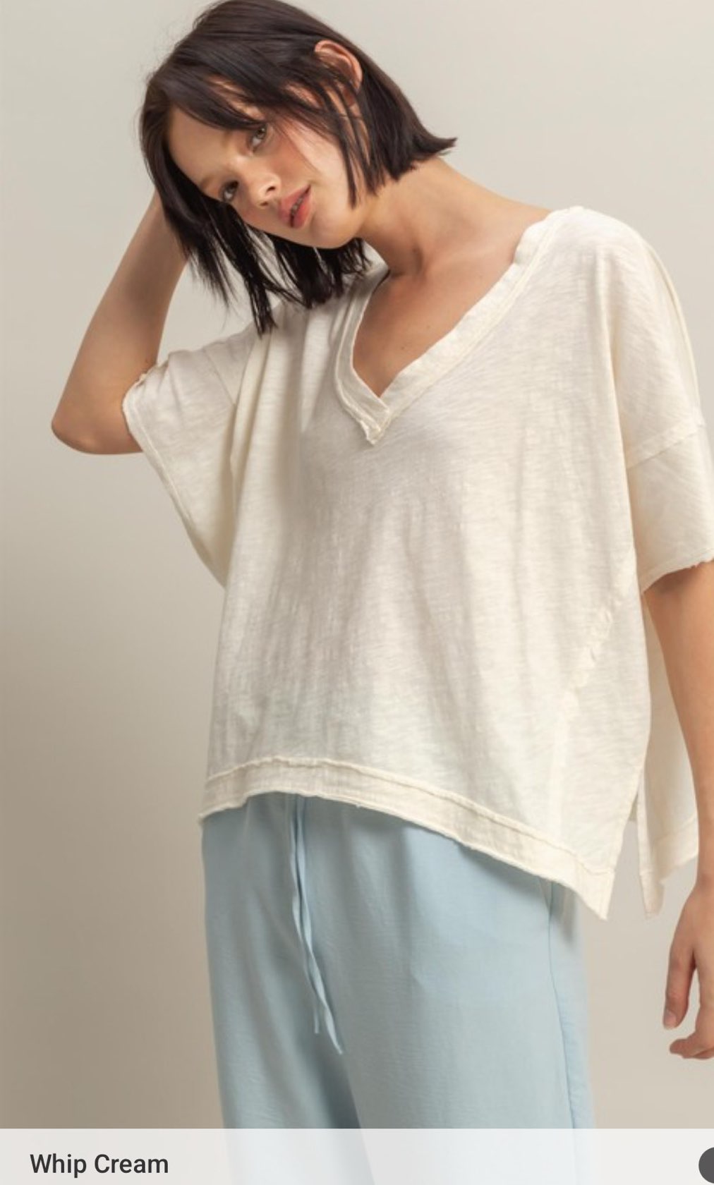 Lightweight Fabric Shapes This Top That Has A V Neckline, Short Sleeves And Side Slit Detailing Along The Hem. The Raw Edge Cut Detail Gives This Shirt A Super Casual Touch.